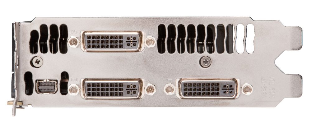 GTX 590 bliver som standard leveret med tre Dual Layer DVI-I-stik og et enkelt Mini DisplayPort-stik, så du hurtigt kommer i gang, hvis du har stillet en myriade af fladskærme op på skrivebordet.