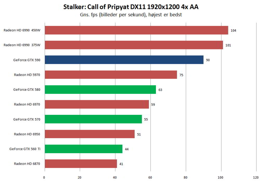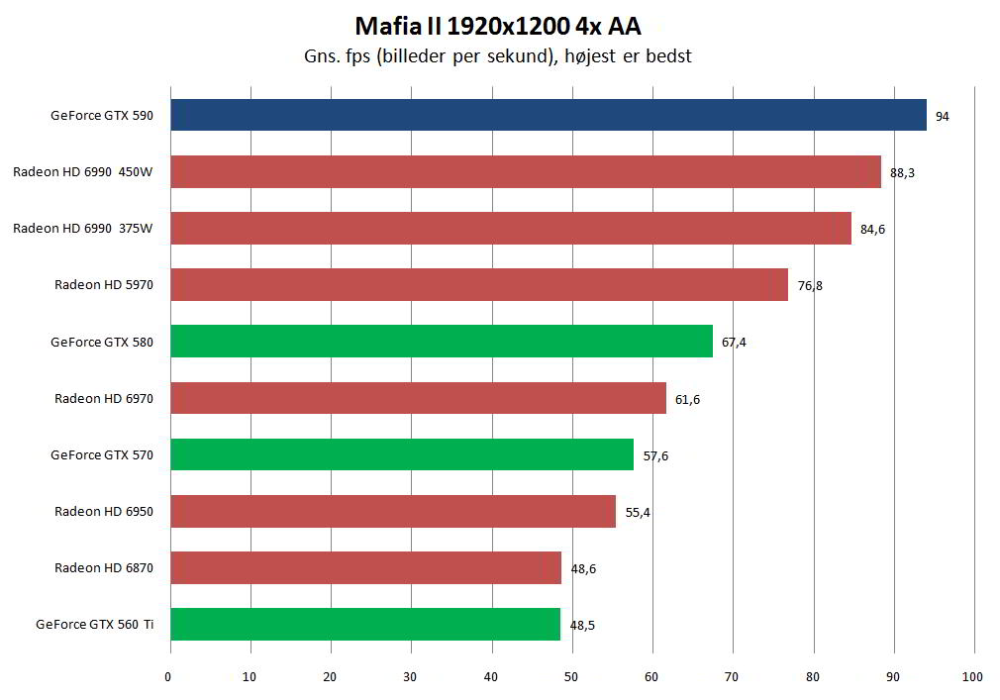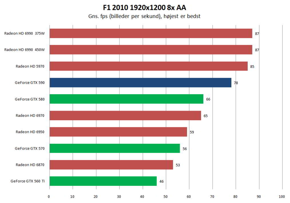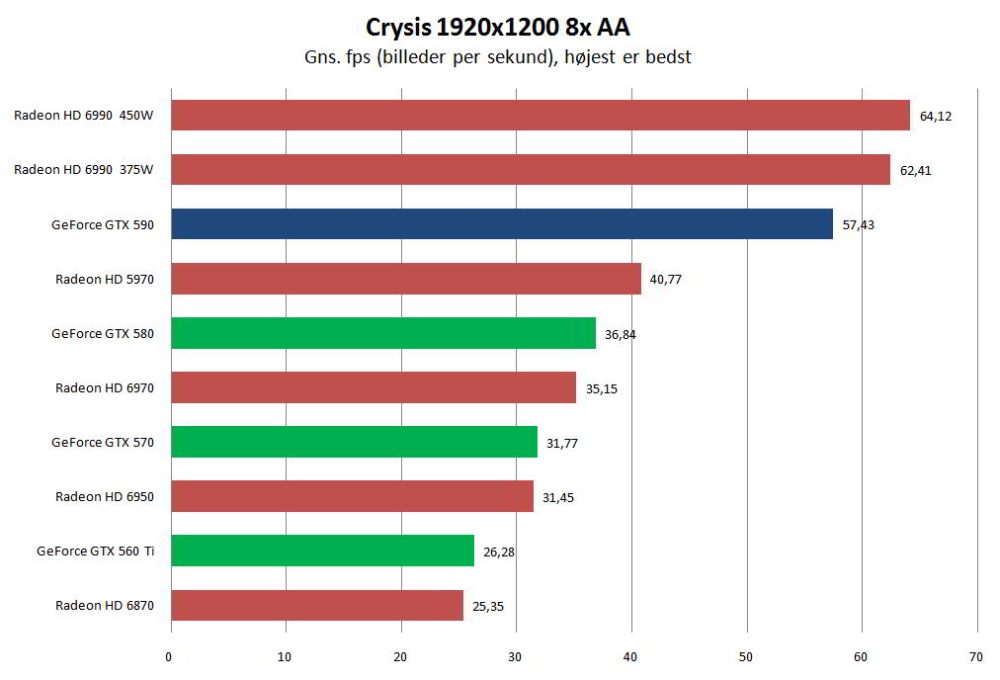 Svaret afhænger af, hvilket spil vi baserer vores bedømmelse på; over en bred kant er de to kort ydelsesmæssigt ret jævnbyrdige. Og det er - særligt for Nvidia - en vigtig præstation, da grafikproducenten har haft lidt svært ved at følge med AMD's hurtigste udspil siden HD 5970.