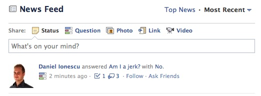 Denne skribent har endnu ikke set Spørgsmål-featuren dukke op under sit nyheds-feed, men det skulle se ud som på billedet til højre.