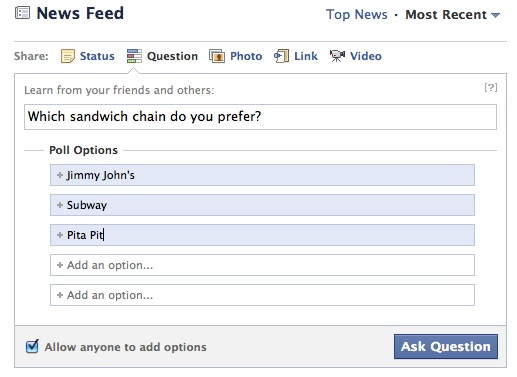 I stedet for et åbent spørgsmål i en statusopdatering, der besvares i kommentar-feltet har du med Facebook Spørgsmål mulighed for at angive en række svarmuligheder. Du vælger selv, om dine venner skal begrænses til dine foruddefinerede svar, eller om de selv kan tilføje andre svarmuligheder.