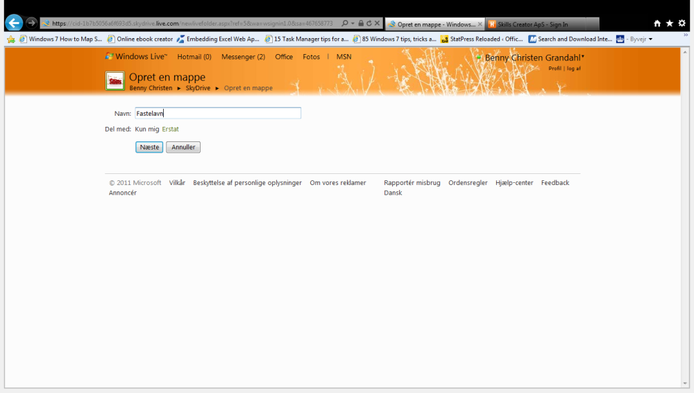 Når du er logget ind på SkyDrive, klikker du på Ny øverst til venstre og vælger Mappe. Giv mappen et sigende navn i Navn-feltet. Lige under Navn-feltet kan du se, at der står Delt med: Kun mig. Klikker du på Erstat-linket kan du ændre rettighederne for, hvem der må se filerne i mappen.