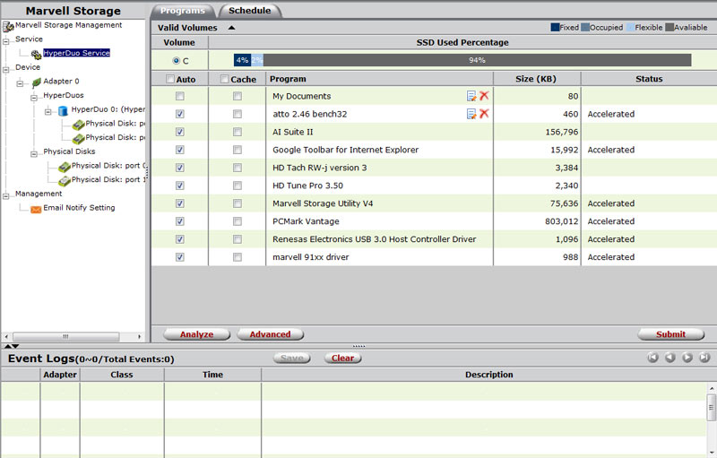 Teknologien leveres af Marvells Serial ATA-controller på bundkortet, der understøtter SATA 6 Gbps-standarden, RAID 0 og 1 - og HyperDuo.