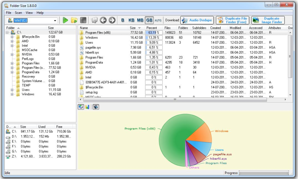 En tredje mulighed er at hente Folder Size, der scanner din harddisk og viser dig et kategoriopdelt cirkeldiagram over dine data.