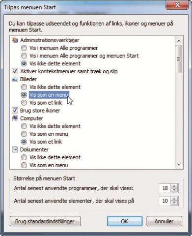 Derefter gælder det om at finde frem til Billeder, Computer, Dokumenter og andre menupunkter i listen og markér Vis som menu-feltet udfor de menupunkter, du gerne vil have vist som en menu.