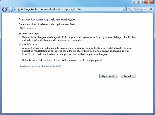 Du opretter en ny bruger ved at vælge Start-menuen | Kontrolpanel | Brugerkonti. Klik på Opret en ny konto og angiv brugernavnet på den nye konto.