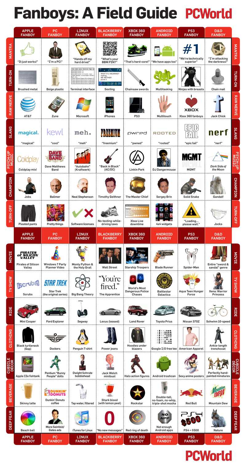 Med skemaet får du et bud på, hvilket tøj en rigtig fanboy går i, hvad han foretrækker at drikke, hvilket køretøj han helst benytter, og hvad han får optur over.