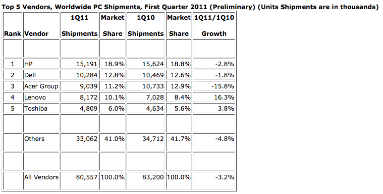 Både HP og Dell på henholdsvis første- og andenpladsen har også oplevet fald i markedsandelene. Kun Lenovo og Toshiba har haft vækst i forhold til første kvartal 2010.