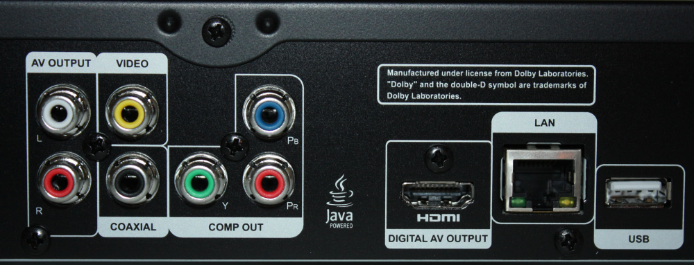 På bagsiden finder vi, hvad man kan forlange af udgange: HDMI, komponent, composite og stereo.