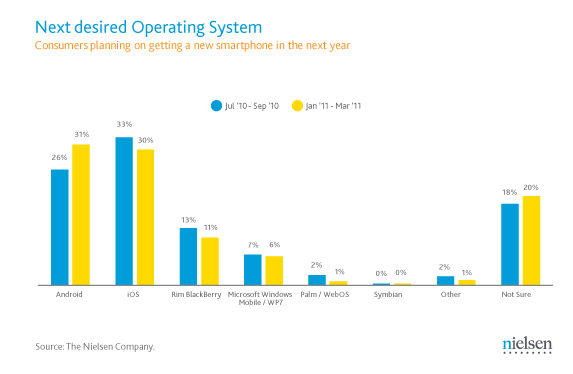 Konklusionen er, at 31 procent af de forbrugere, der blev spurgt mellem januar og marts i år, har Android som deres foretrukne platform. Apples iOS ligger på 30 procent, mens BlackBerry foretrækkes af 11 procent.