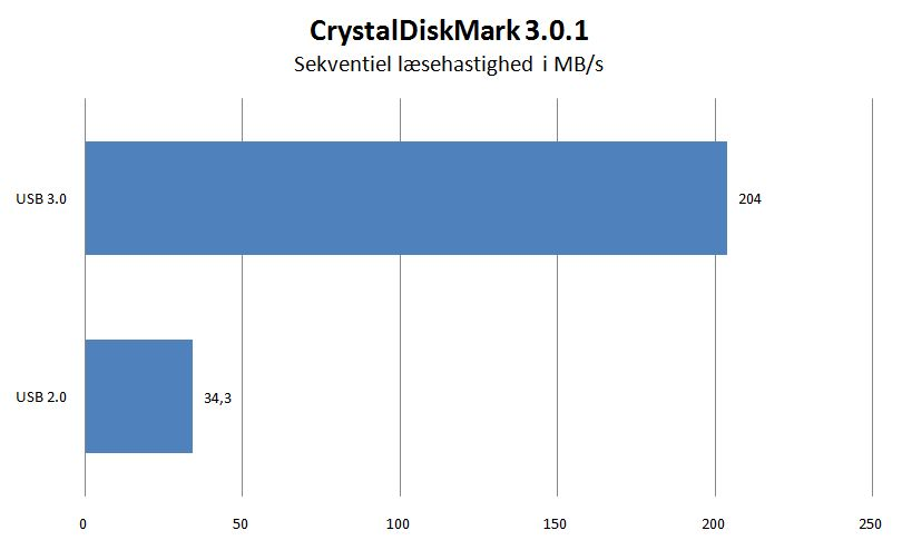Almindelige harddiske formår ikke at levere overførselshastigheder, der kommer bare i nærheden af USB 3.0-standardens højtflyvende maksimum. Da vi sidst testede en ekstern harddisk med USB 3.0, nåede vi eksempelvis en læsehastighed på godt og vel 139 megabyte per sekund. Selvom fremgangen var stor sammenlignet med USB 2.0, var der stadig meget langt op til det ydelsesmæssige loft, som i praksis må forventes at være omkring 400 megabyte per sekund.