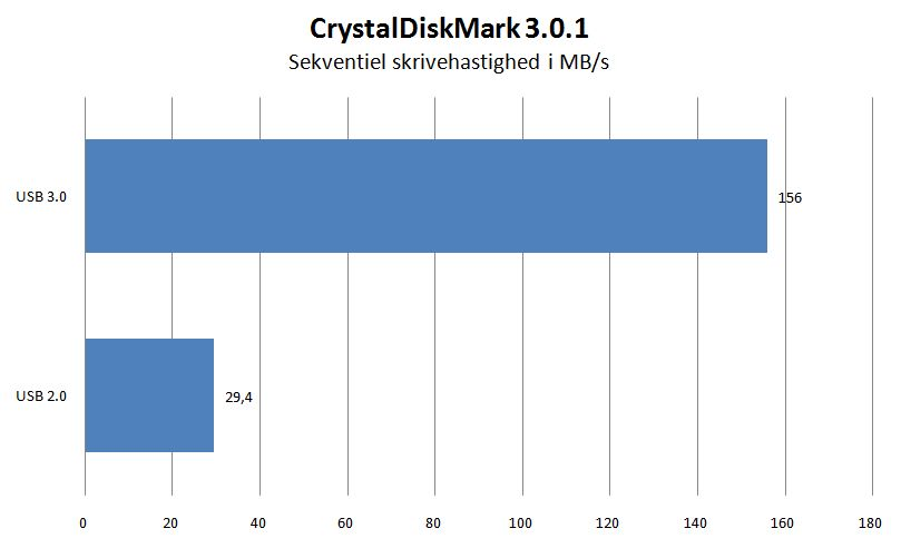 Til sammenligning lover USB 3.0 teoretiske hastigheder på op mod 600 megabyte per sekund, hvilket vil sige, at den samme fil allerede ville være flyttet efter knap 8 sekunder.