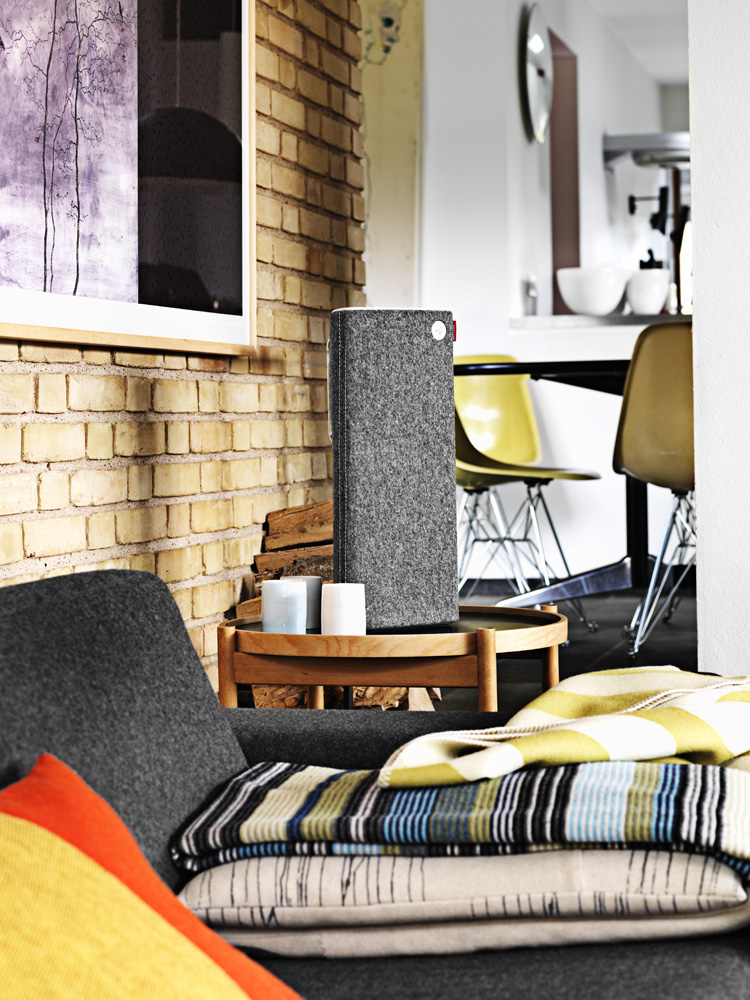 Den dansk-udviklede højttaler glider naturligt ind i indretningen, fordi den ligner et møbel eller en kunstgenstand: En trekantet søjle med runde former og ulden stofbeklædning.