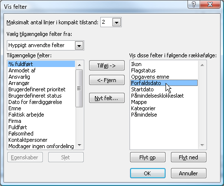 1. Højreklik på Arrangeret efter-knappen, og vælg Brugerdefineret. Klik på Felter-knappen, og øg antallet af linjer i kompakt tilstand til to. Flyt Forfaldsdato-feltet op til fjerde position i Vis disse felter i følgende rækkefølge-listen.