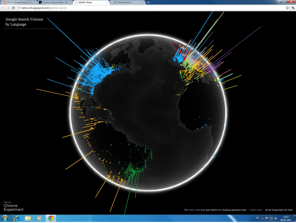 Forestil dig et klassisk pindediagram, som det kendes fra folkeskolen. Forestil dig det så i 3D og spredt ud over en stor, mørk klode med verdensdelene indtegnet. Så har du den nye Google Search Globe, som selskabet netop har præsenteret på sin egen blog.