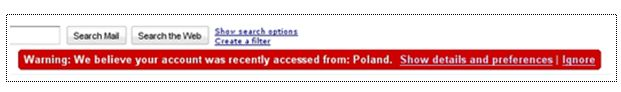 Det nye er, at hvis der foregår noget usædvanligt, så giver Google dig besked ved at levere en advarsel; "Warning: We believe your account was last accessed from…" Oversat betyder det "Advarsel: Vi mener, at der sidst blev kigget på din konto fra…" og så en beskrivelse af det geografiske sted, som Google er i stand til at fastslå, at besøget kom fra eksempelvis 'Polen' eller 'Irland'.