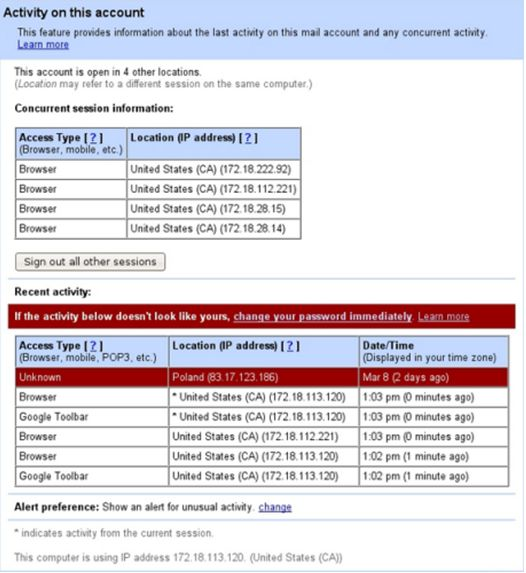Allerede for halvandet års tid siden havde Google en facilitet klar, der loggede de seneste aktiviteter på kontoen. Denne information kan du stadig se i bunden af din indbakke, hvis du bruger Gmail.