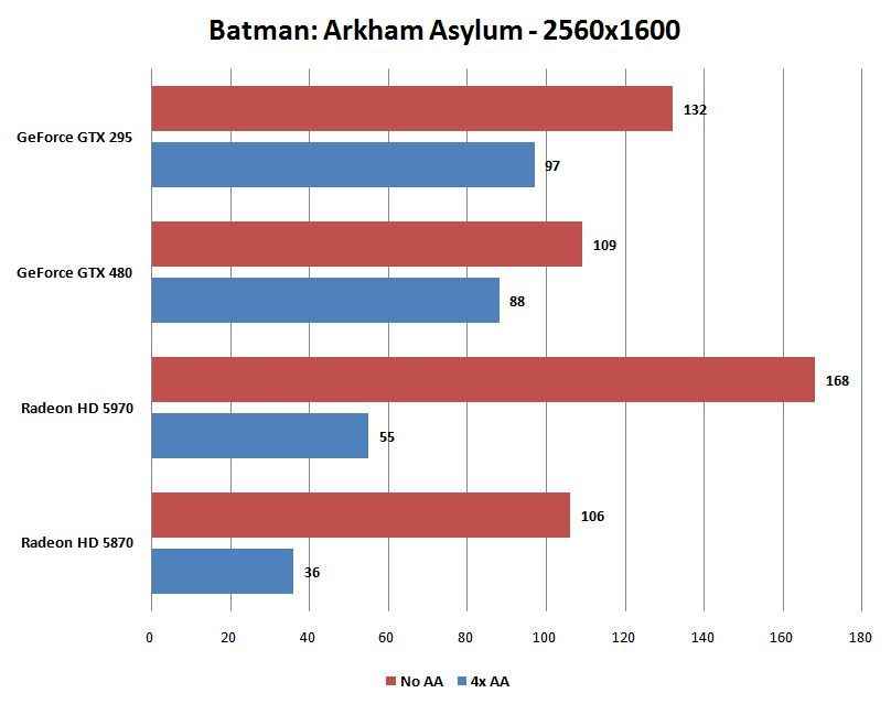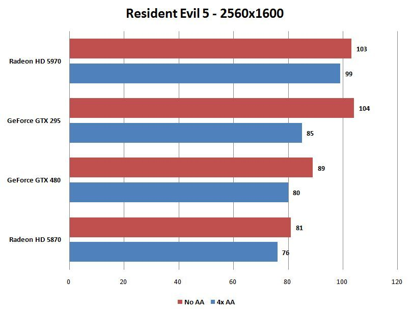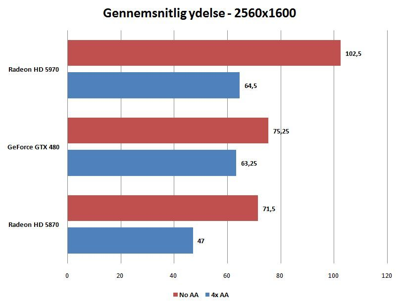 Den tandudtrækkende opløsning på 2.560 x 1.600 pixels, der er standard på en 30 tommer pc-montor, viser, at Nvidias nye monsterkort i visse scenarier sniger sig tæt på Radeon HD 5970.