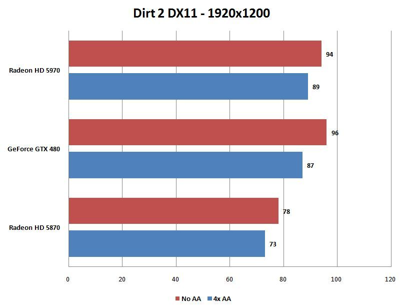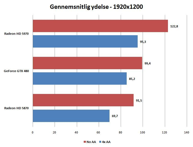 GeForce GTX 480 er markant på banen i forhold til det billigere Radeon HD 5870, men ydelsesforskellen retfærdiggøres ikke helt af merprisen, når den benyttede skærmopløsning lyder på 1.920 x 1.200.