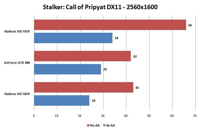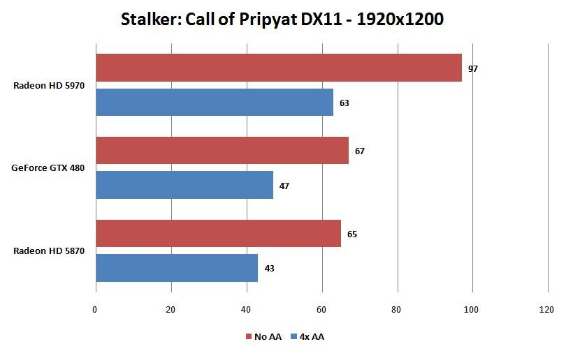 Vores Call of Pripyat- samt Dirt 2-benchmarks er afviklet i DirectX 11-versionen, så vi lægger maksimalt pres på testens kort. Samtlige spil er afviklet med absolut højeste kvalitetsindstillinger samt varierende grader af kantudjævning, kendt som anti-aliasing.