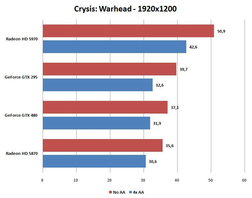 Bemærk at vi med den ekstremt høje opløsning har udeladt at benchmark-teste med Crysis: Warhead, fordi spillet gik ned ved flere lejligheder og langt fra kørte stabilt.