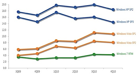 I løbet af første kvartal af 2010 var 14 ud af 1.000 XP-computere (med servicepack 3) udsat for skadelig kode, mens tallet i første kvartal 2010 var 17.