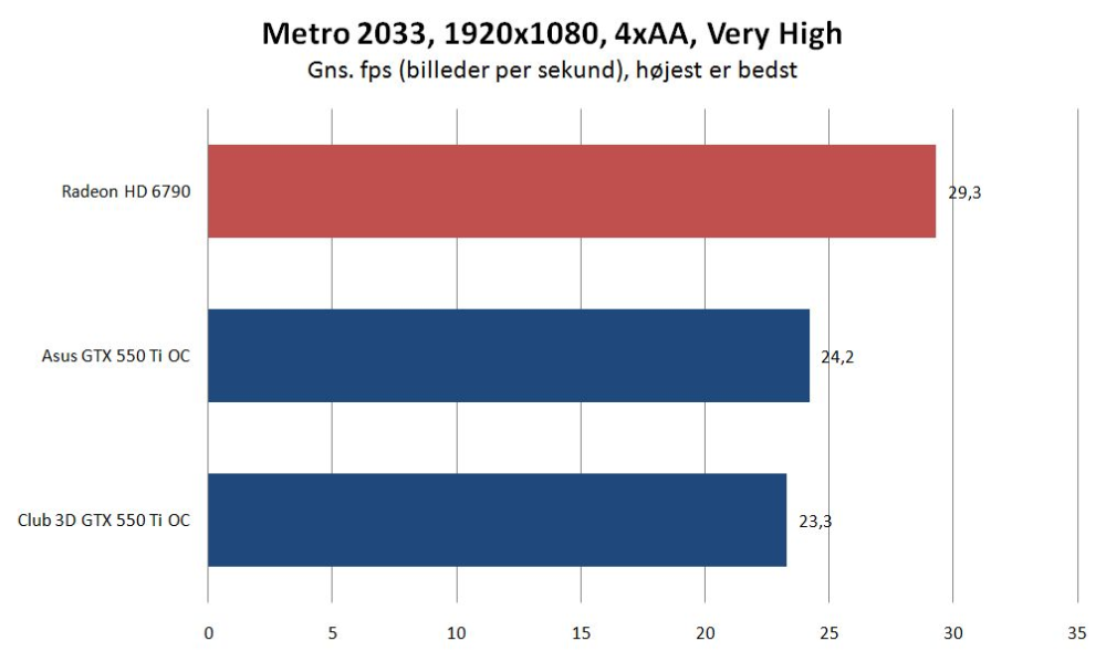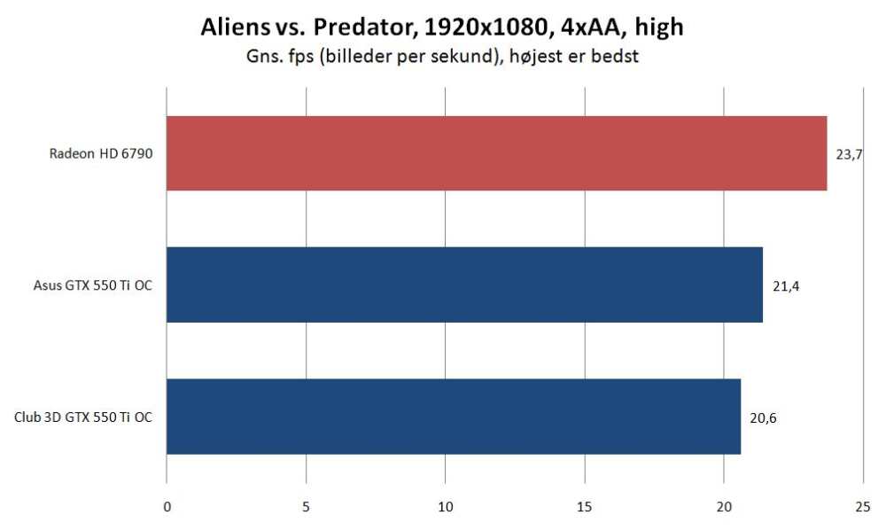 Ydelsesmæssigt snapper Club 3D-kortet gennemgående Asus' variant i hælene, og vi bliver igen mindet om, at vores testopløsning på 1.920 x 1.080 pixel er en kende for meget for de hårdt prøvede billigkort, der foretrækker at slå sig løs i opløsninger på op til 1.680 x 1.050.