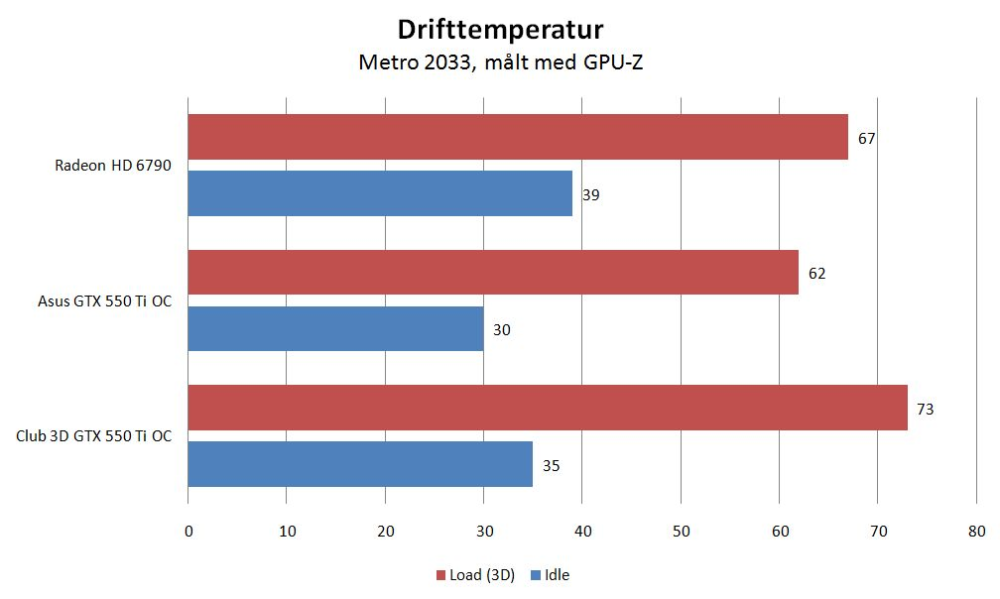 Køleren lader til gengæld til at være væsentligt mere gennemarbejdet end Club 3D-løsningen, og en hurtig load-test med den krævende shooter Metro 2033 afslører, at Asus holder fanen højt med en driftstemperatur, der er rundt regnet 10 grader lavere. Det har stor indflydelse på især overclocking-potentialet, hvor Asus' GTX 550 Ti-kort må ventes at være det bedste valg af de to.
