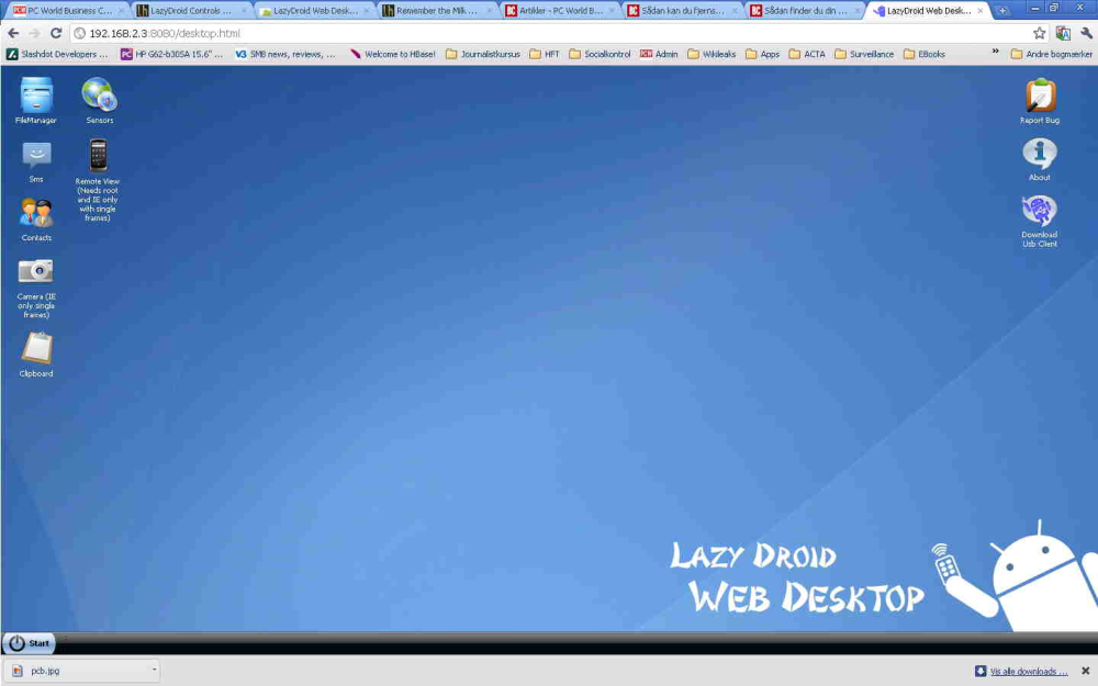 Jeg tastede blot 192.168.3:8080 ind i min browsers adresse-felt. Og vupti; så var der adgang til LazyDroid desktop som vist på billedet til højre.