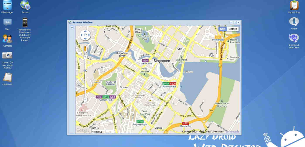 Du kan også få adgang til mobiltelefonens sensorer som accelerometer og GPS. Af en eller anden årsag troede LazyDroid dog, at denne skribents mobiltelefon befinder sig i Singapore. Hvis jeg ikke selv kunne se den ligge på mit skrivebord, ville jeg være bange for, at den var stjålet og afskibet til udlandet.