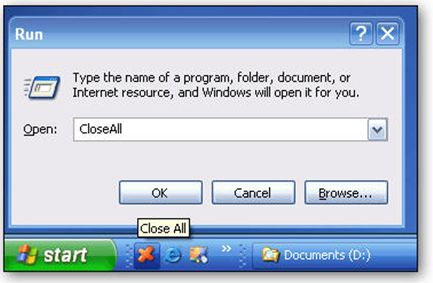 Den bedste måde at bruge Close All Windows er ved at tilføje ikonet til proceslinjen nederst til venstre på skærmen (Windows XP- og Vista-brugere kan placere ikonet i deres Quick Launch toolbar).