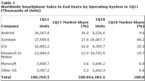 Den helt store vinder fra kvartal til kvartal blev Googles Android, der gik fra en global markedsandel på 9,6 procent sidste år til 36 procent ved udgangen af første kvartal i år.