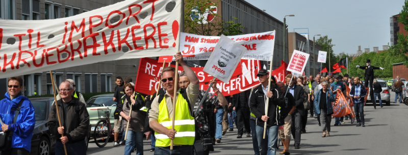 Fra 3F's parkeringsplads går den store menneskeflok i et godt 200 meter langt faneoptog mod CSC's hovedkvarter på Retortvej lidt over en kilometer væk.