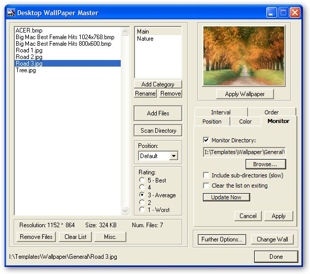 Wallpaper Master (besøg websiden her | hent programmet her) lader dig indstille intervallet, med hvilket baggrundsbilledet skal erstattes af et nyt, kan synkroniseres op imod en foruddefineret filmappe, så dine nyeste pletskud finder vej ud på fladskærmen - og meget mere.