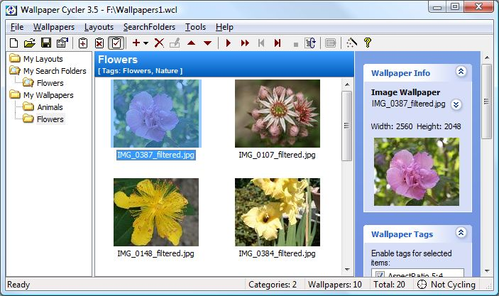 Til gengæld kan EvJO Wallpaper Changer, som har en meget intuitiv brugergrænseflade, automatisk hente billeder fra flickr og afsøge harddisken efter billeder på basis af tags og tekst.