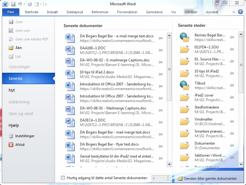 Herefter kan du redde de dokumenter, som du ikke nåede at få gemt, ved at klikke på Filer-knappen | Seneste.