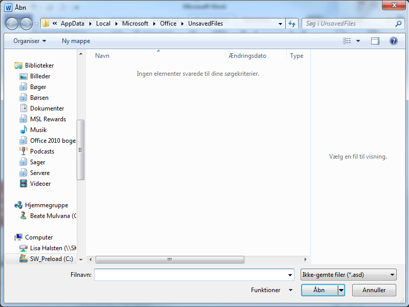 Gendan et ikke-gemt dokument