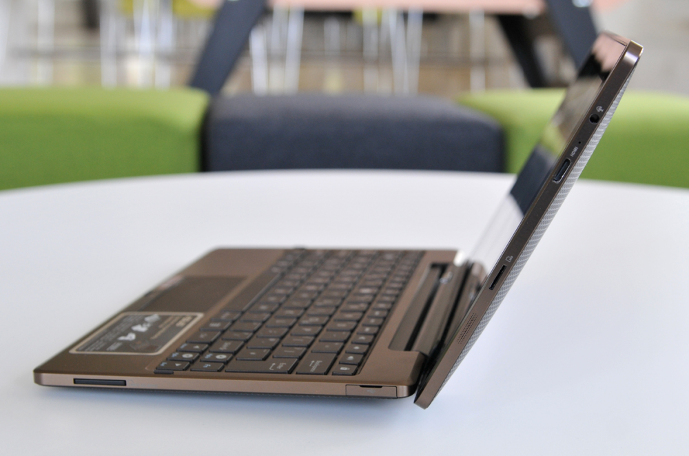 Tablet-delen - og dermed skærmen - låses fast i et hængsel på dockingstationen, og du kan dermed åbne og lukke den som en traditionel netbook.
