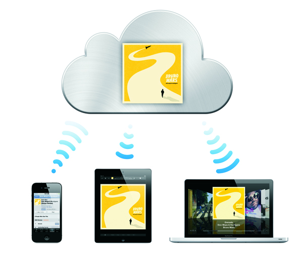 Sådan illustrerer Apple musik-delen af iCloud, hvor indkøb i musikbutikken iTunes automatisk overføres til forskellige enheder.