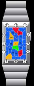 Tiden vises med de koncentriske ringe eller 'vinduer'. Den ydre ring repræsenterer timer, den midterste ring repræsenterer fem minutters blokke og gruppen af vinduer i midten viser minutterne fra et til fire.
