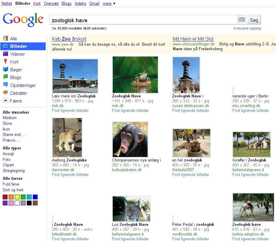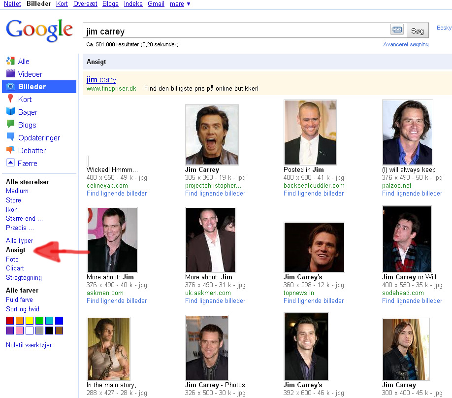 Det er også muligt at få vist billeder, hvor søgningen er begrænset til at vise ansigter. Som her: