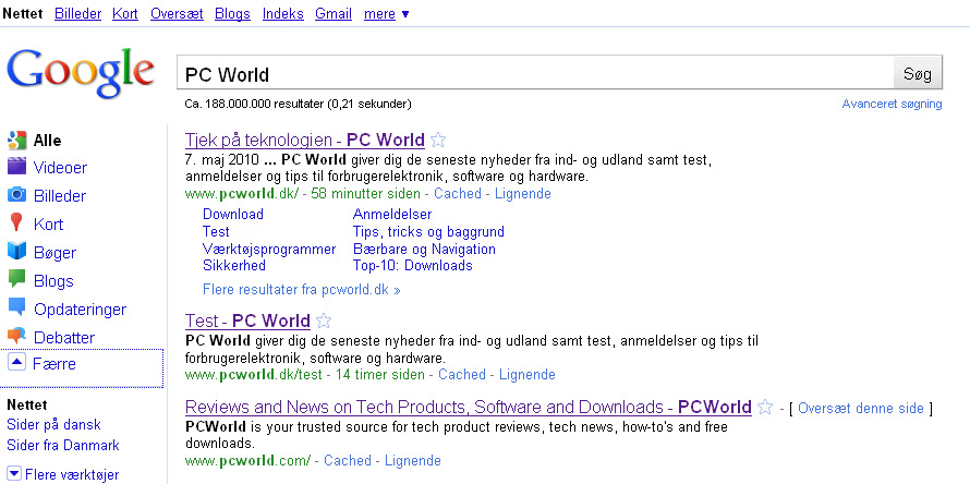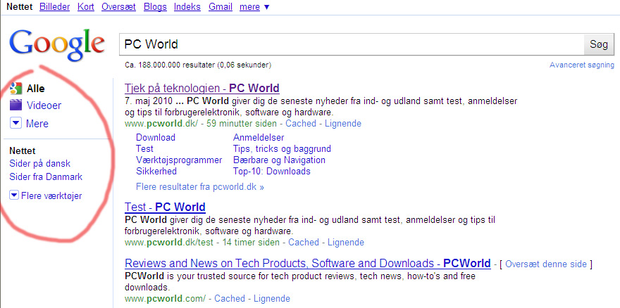 Det er først, når du har foretaget en søgning, at du ser forandringerne i menuerne i venstre side. Traditionelt har Google ikke foretaget dramatiske ændringer i sit design, men det nye tiltag er faktisk et stort skridt.