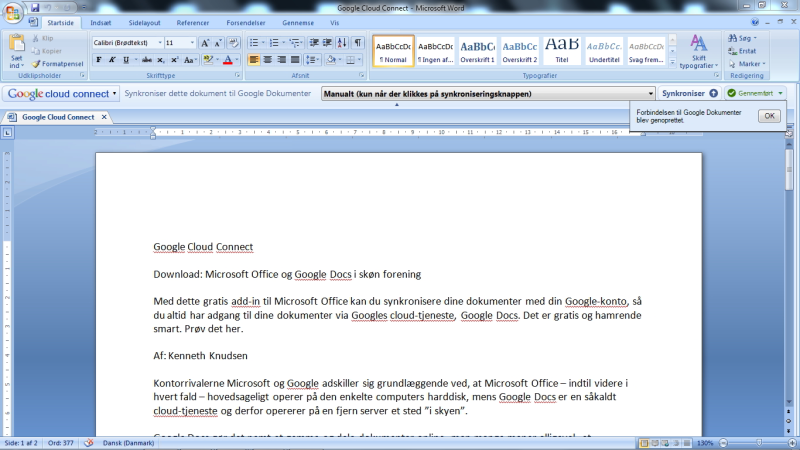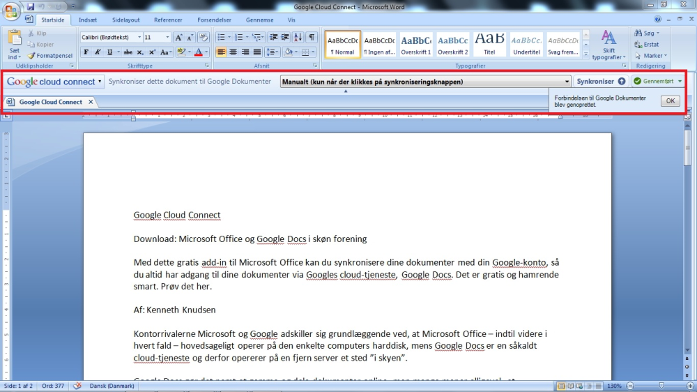 Med Google Cloud Connect får du en værktøjslinje i Office, der gør det muligt at gemme dine dokumenter på Google Docs. Du skal blot blot klikke på 'Sync'-knappen, hvorefter det smarte add-in automatisk synkroniserer dokumentet med den version, der figurerer i skyen, hver gang du gemmer dokumentet i Office. Du kan naturligvis finjustere synkroniseringsindstillingerne efter smag og behag.