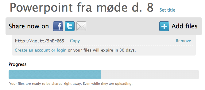 Når du har valgt dine filer, blive du sendt videre til en ny side, der giver dig et direkte link til dine filer. Selv om filerne stadigvæk er ved at blive uploadet, kan du allerede nu maile linket til dine kolleger eller forretningsforbindelser.
