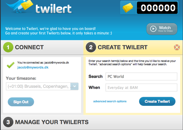 Det er kort sagt en søgning efter nogle bestemte ord på Twitter, som Twilert dagligt eller ugentligt sender dig resultatet af per email.