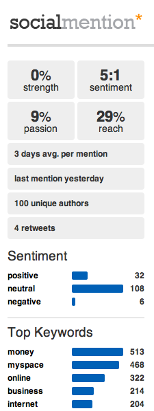 Ud over at oplyse dig om, hvordan din virksomhed bliver omtalt, giver Social Mention dig også en række statistikker, der blandt andet oplyser om, hvor mange gange dit søgeord er blevet brugt i en negativ eller positiv sammenhæng.