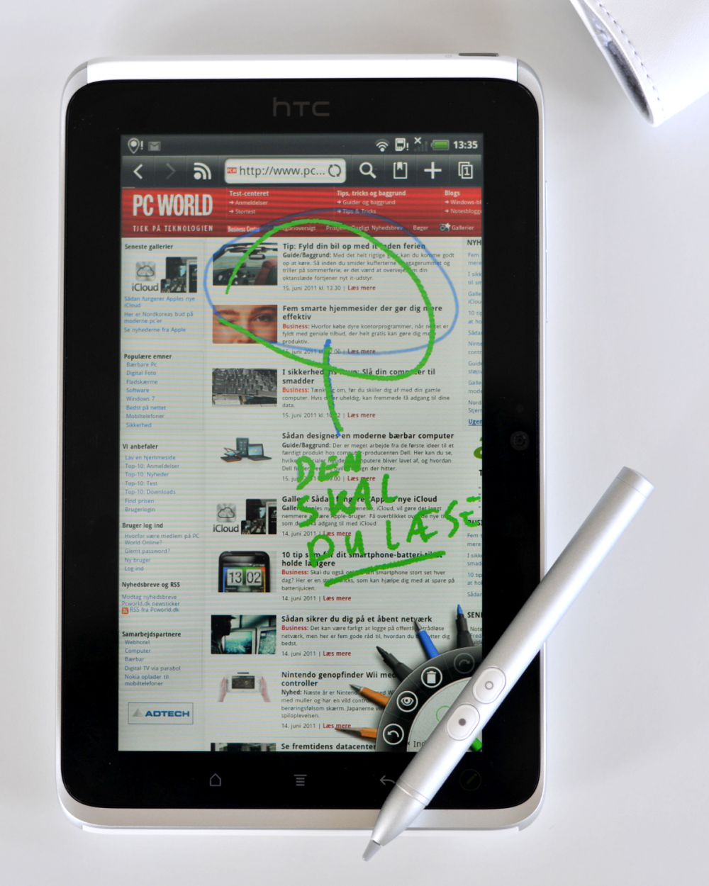 Den store gimmick ved HTC Flyer er naturligvis stylus'en, som desværre ikke virker særlig overbevisende. For det første er stylus'en batteridrevet, og du kan kun bruge den med skærmen. Glem alt om at prikke til Flyer med toppen af en kuglepen.