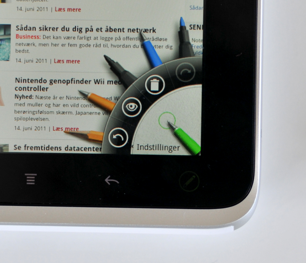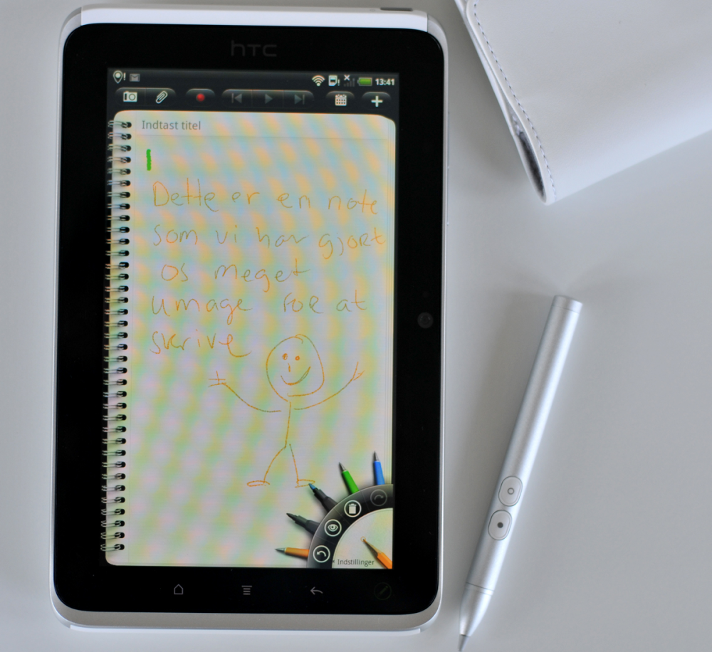 Til gengæld har HTC i bogstaveligste forstand opstillet en palette af muligheder for at få stylus'en til at opføre sig som en blyant, kuglepen eller tusch. Det er naturligvis også muligt at ændre størrelse og farve. Det styres fra højre hjørne af skærmen og fungerer udmærket.