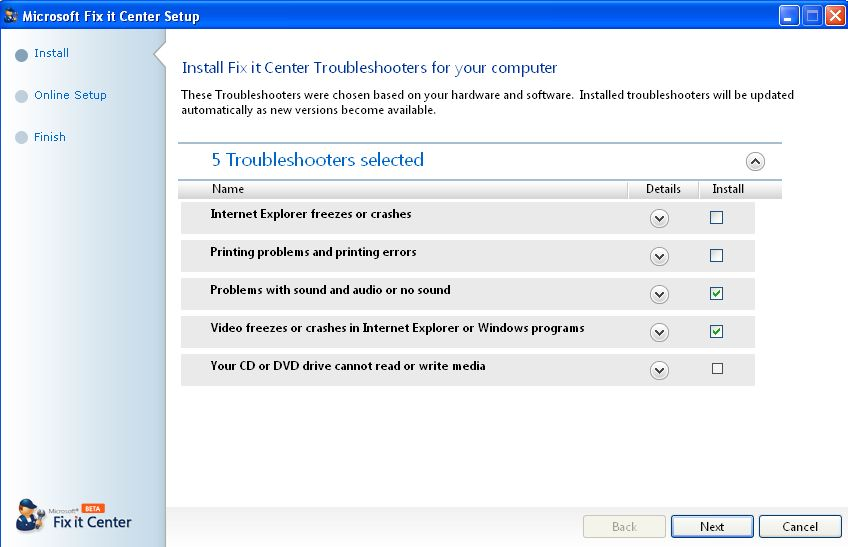 Der findes også en online Fix It-tjeneste, men hvis man har problemer med at komme online, så er det rart at have en version af fejlfindertjenesten installeret på sin computer.
