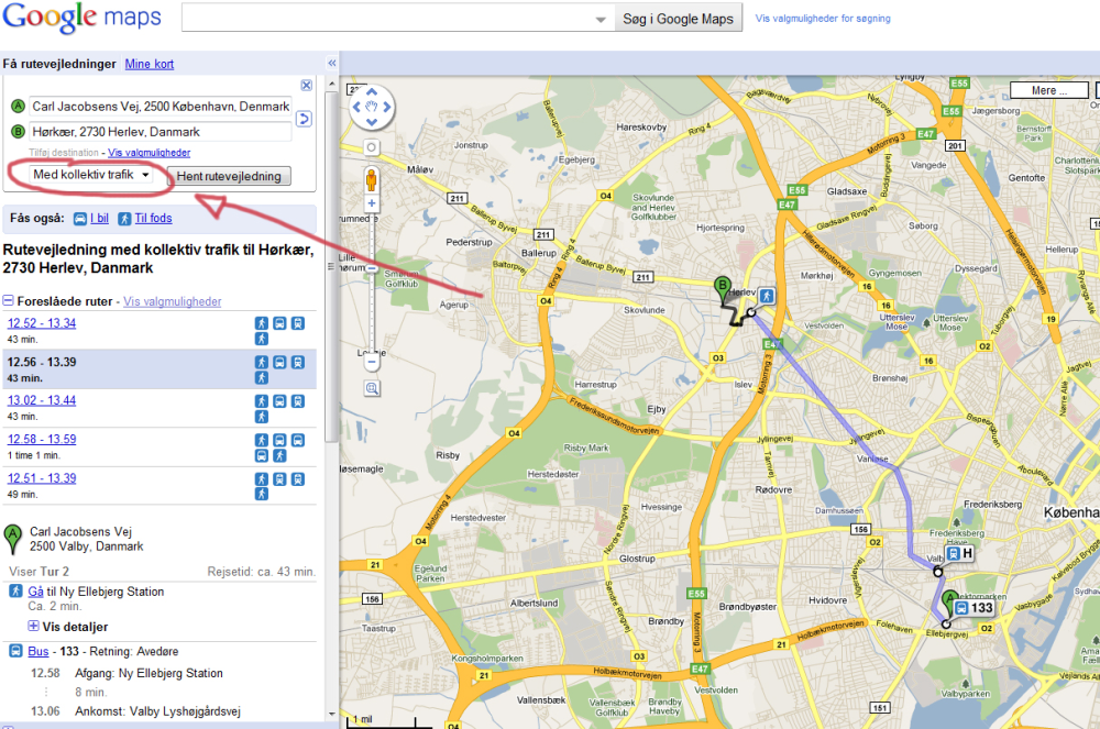 Som default står der "i bil" - vælg i stedet "med kollektiv trafik". Klik til slut på "Hent rutevejledning".