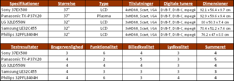 Men hvad skal du vælge, hvis du skal udskifte fladskærmen med en ny og bedre model - uden at smadre husholdningsbudgettet? Vi har testet fem nye og aktuelle modeller fra Samsung, Sony, Philips, LG og Panasonic. Alle modeller fås til priser under 6.000 kroner, og vi har testet Sony 37EX500 (37 tommer), Panasonic TX-P37X20 (37 tommer), LG 32LD550N (32 tommer), Samsung LE32C455 (32 tommer) og Philips 32PFL8404H (32 tommer)